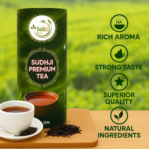 SUDHJI Premium Tea is crafted from a premium blend of 5 unique tea leaves sourced from Upper Assam, known for their robust flavour, rich aroma, and natural freshness. Each leaf is carefully handpicked from high-quality tea gardens to create the perfect balance of strength, colour, and smoothness in every cup.
